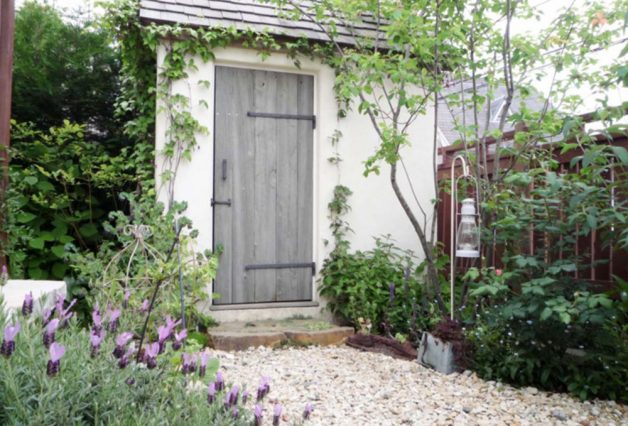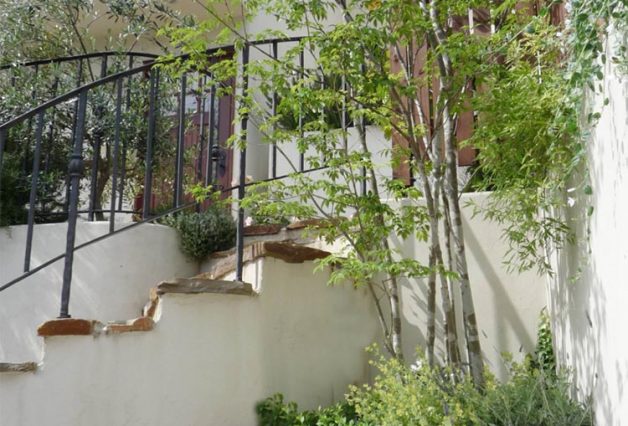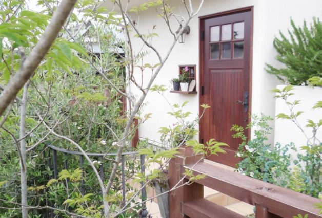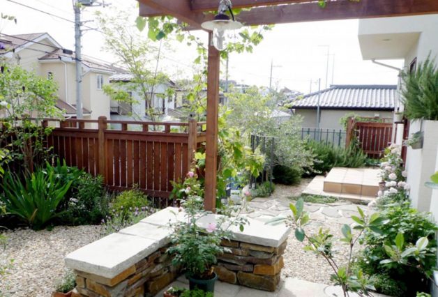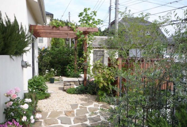 道路から2mほどの擁壁上に家が建っており、道路と同じレベルの駐車場、階段、擁壁上の庭と、建物全体の雰囲気に合わせトータルに工事を行いました。オリジナルの門扉と共に、アール状に上がっていく階段にはロートアイアンの手摺りを付けました。リビングに面したスペースには、石のテラスとパーゴラを設け、左官材で仕上げたかわいい物置を庭の奥に配し、フォーカルポイントにしています。外周は道路からの目線を遮るように、ウッドフェンスで囲み、つる植物を絡められるようにしています。