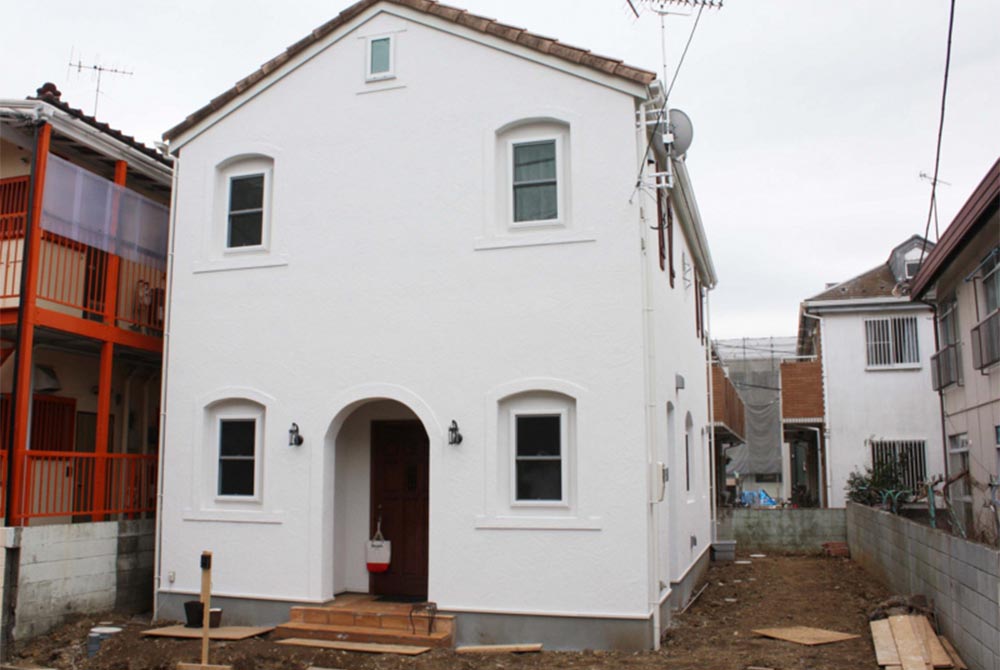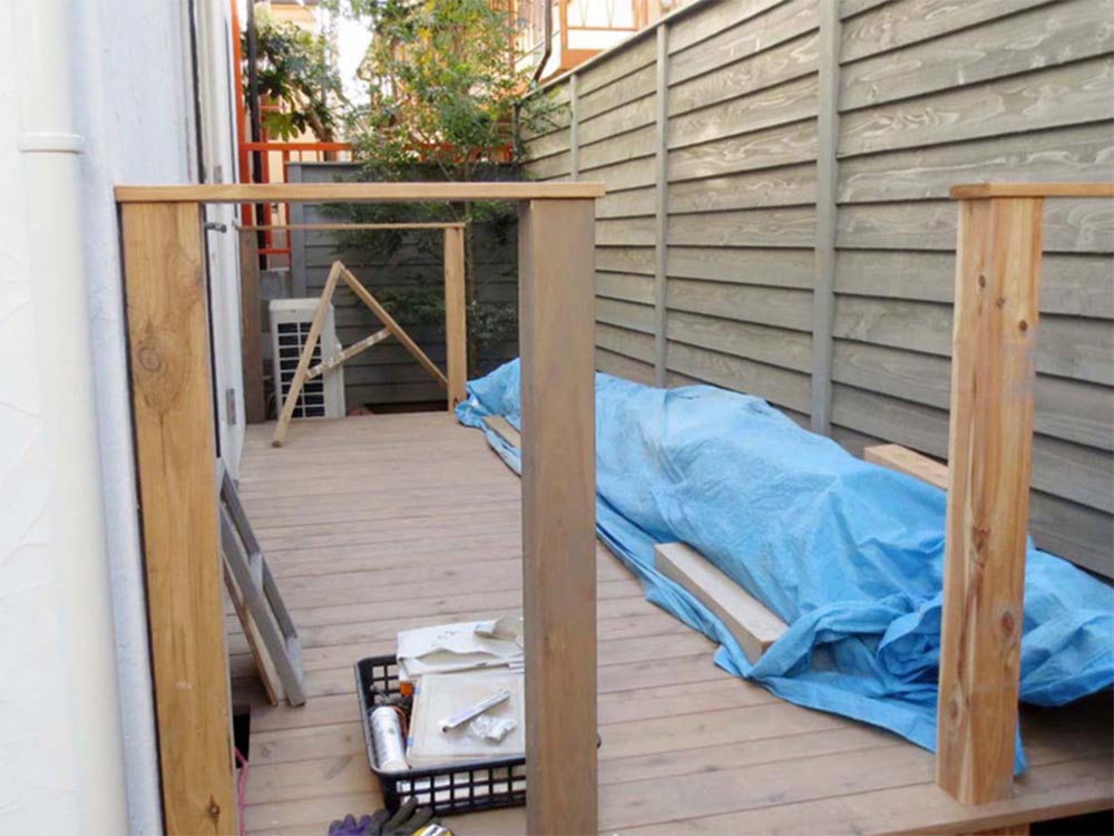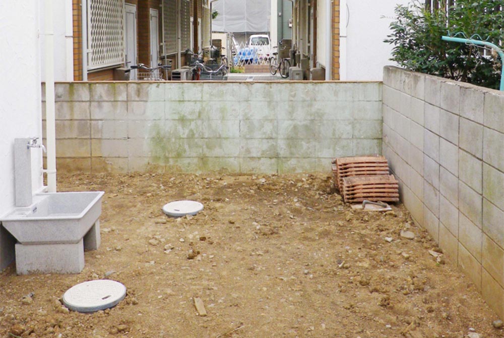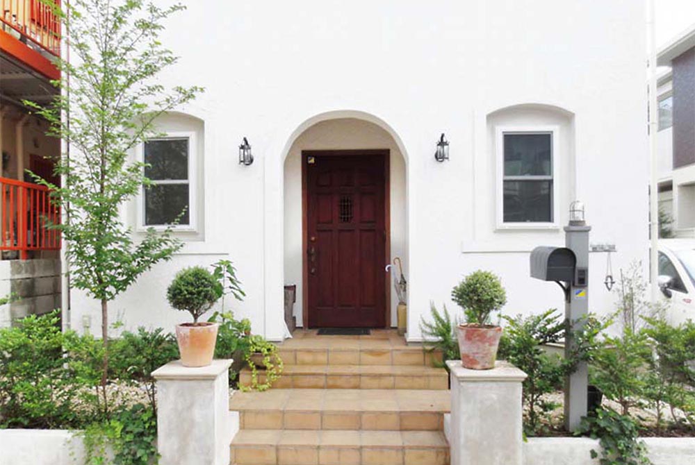 新築のお宅。ファサードはお家の雰囲気に合うよう、シンメトリーを意識しました。周りをアパートに囲まれているため、デッキとお庭の周りに既存のブロック塀を隠しながら高さのある目隠しフェンスを設置。ブ ルーグレーの落ち着いたトーンに緑が映える空間となりました。小屋は収納としてはもちろんのこと、お庭の景色にも欠かせないポイントとなっています。