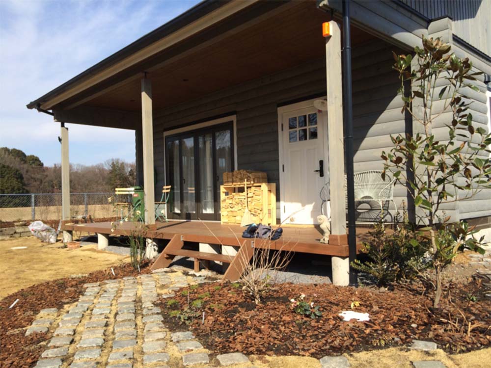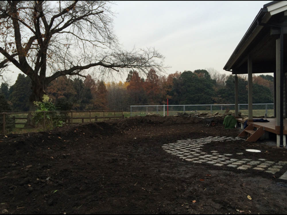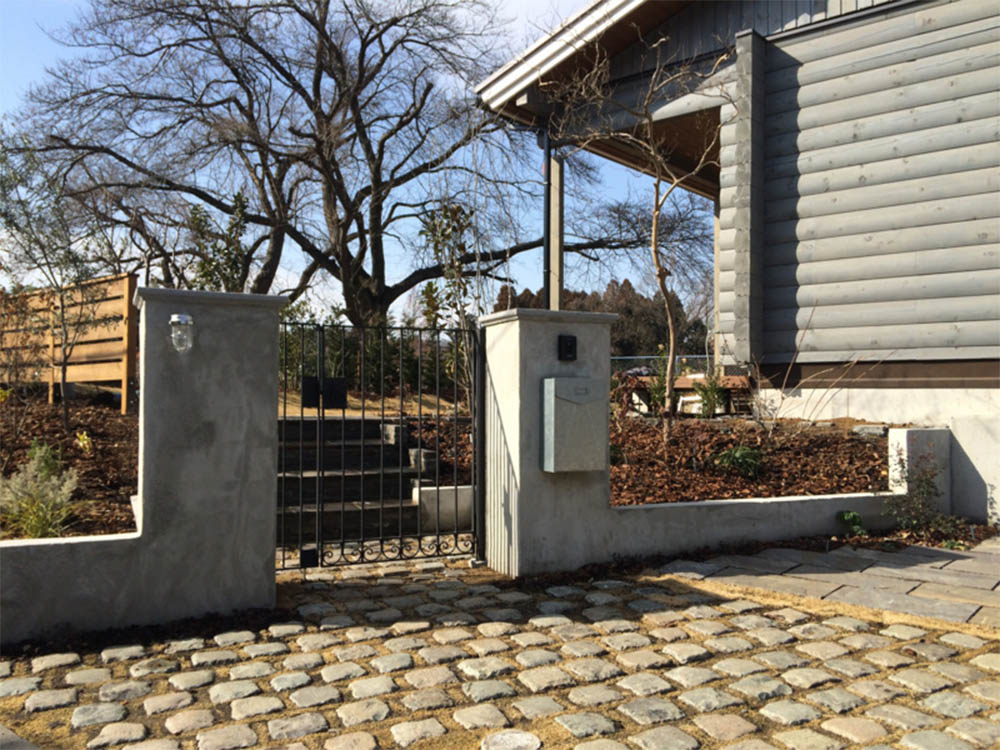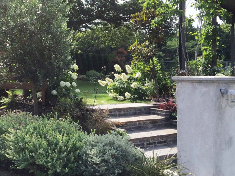 芝生の広場にアンティークストーンの小道が弧を描くように続き