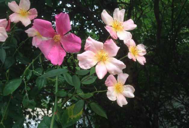 アプリコットピンクから濃いピンクへ、色変わりしながら咲き続ける丈夫な一重のバラです。