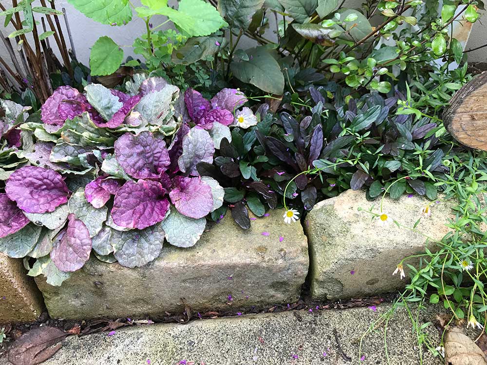 いくつかの出回っているアジュガの品種の中でも一番使用頻度の高い品種。濃い緑~紫のグラデーションでシックな葉色のため様々な色合いと合…