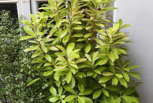 日本のシキミの仲間で、明るい葉色は赤みを帯びた枝とのコントラストも魅力的。丈夫で手間もかかりません。