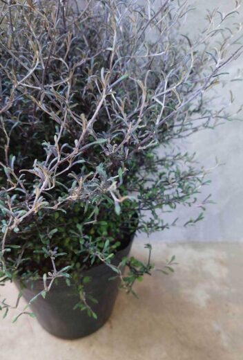 葉が小さく、新梢の茎と葉裏が黒灰色で全体がくすんだ灰緑色に見え、落ち着きのある魅力的なグリーンとして活用できる植物です。