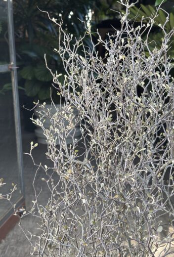 ニュージーランド原産の常緑低木で、渋めの落ち着いたカラーとくねくね曲がった枝がユニーク。植栽帯で異彩を放ちます。