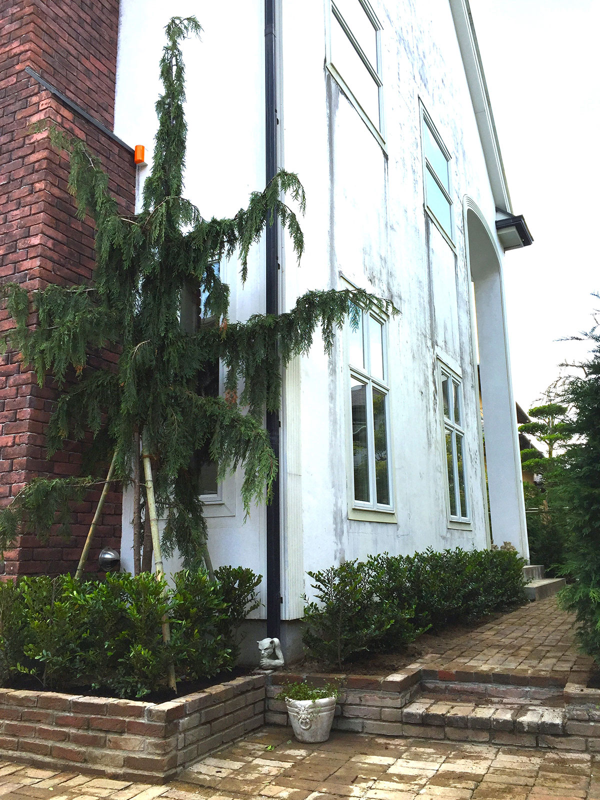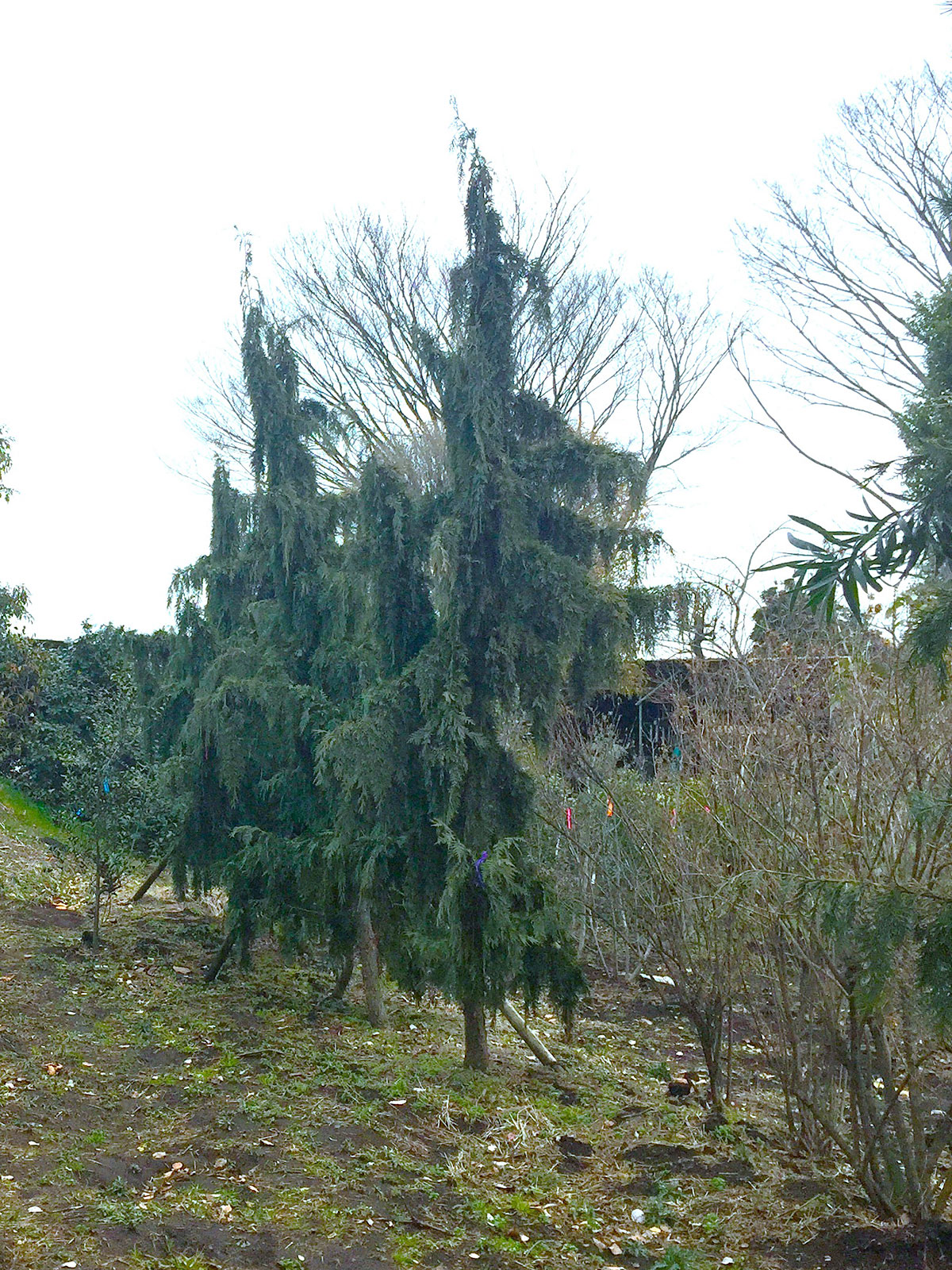 枝垂れタイプの針葉樹はいくつか流通しており、主軸が無いタイプもありますが、本種は主軸があり、形が大きな円錐状になるため扱いやすいです。全体は深い緑で、葉先がやや灰青緑になり、手を広げたように枝が張り、シンボル的になる場所には最適です。