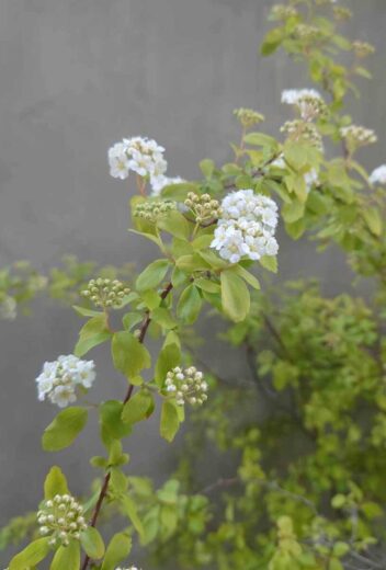 4~5月頃、枝垂れた枝に沿って手毬状の白い花をたくさんつけます。葉の色はやや青みがかり、株から立ち上がった枝は上部で放射状に広がるので、柔らかい印象になります。