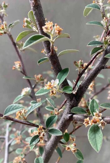 中国、ヒマラヤ原産の低木を中心とした常緑/落葉種で50種ほどあるバラ科の植物、コトネアスター。フランケッティは常緑で、現地では高地の山岳地帯などに自生しています。