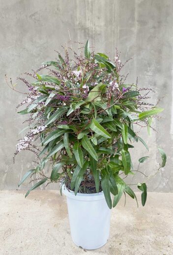 オーストラリア南東部原産の常緑性のツル性花木で、早春~春に鮮やかな紫や白の房状の花をつけ、ほのかに香ります。濃い緑色の葉はかたくしっかりしていて、花とのコントラストも美しいです。