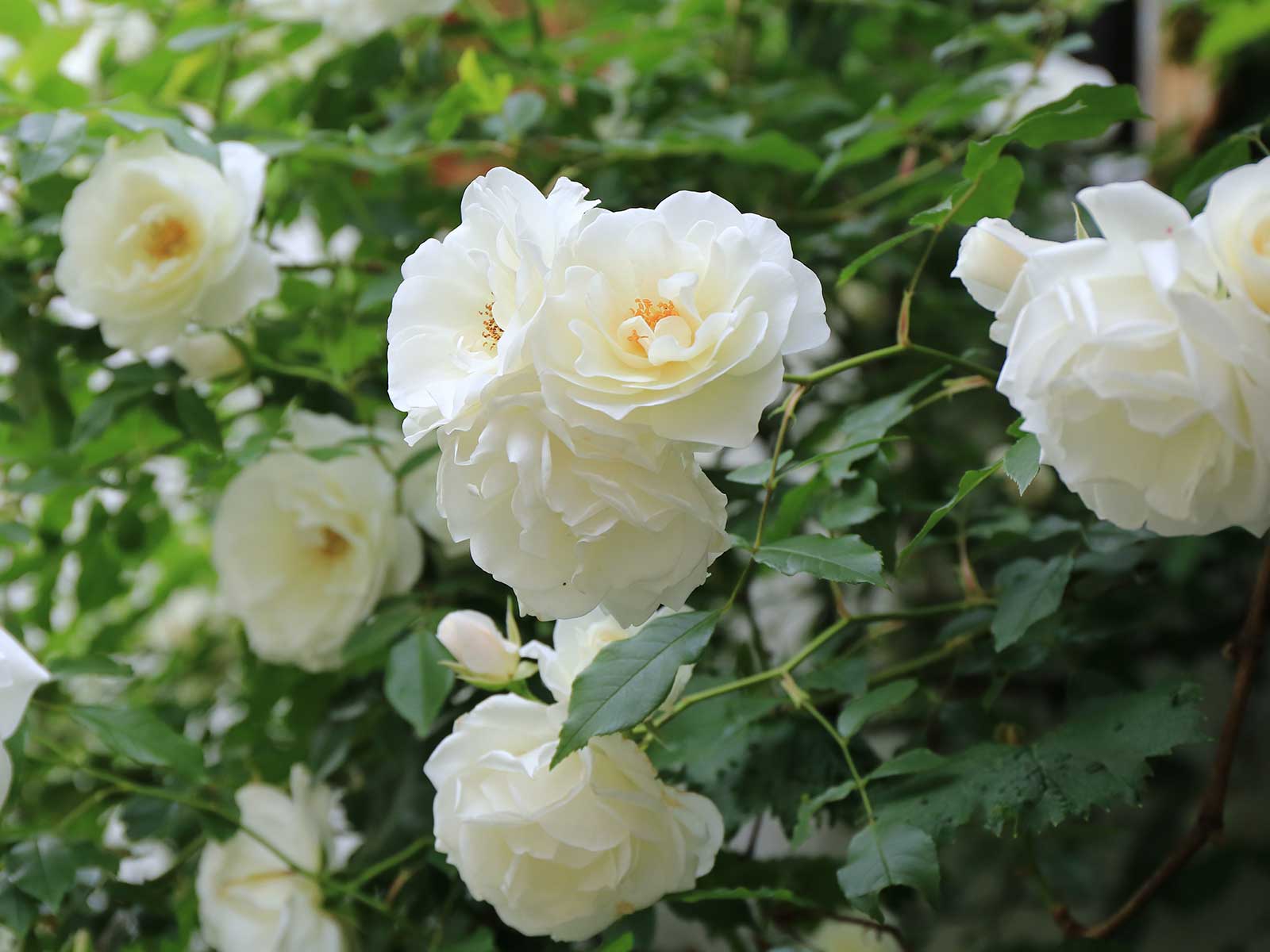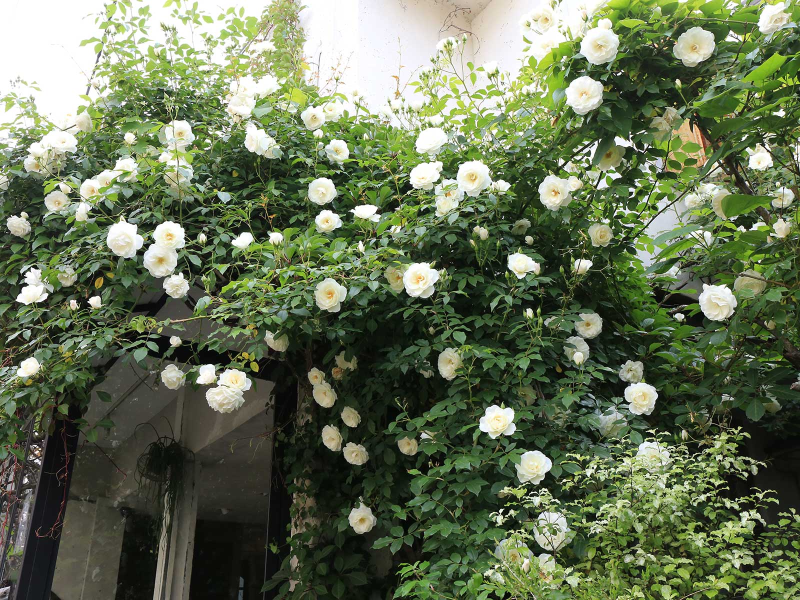 ツルは3~4mほど伸び、一季咲き。青みを帯びた葉と白い花弁のコントラストが美しく、病気にも強い。実であるローズヒップも大きく、お茶やジャムなどにも活用できる。