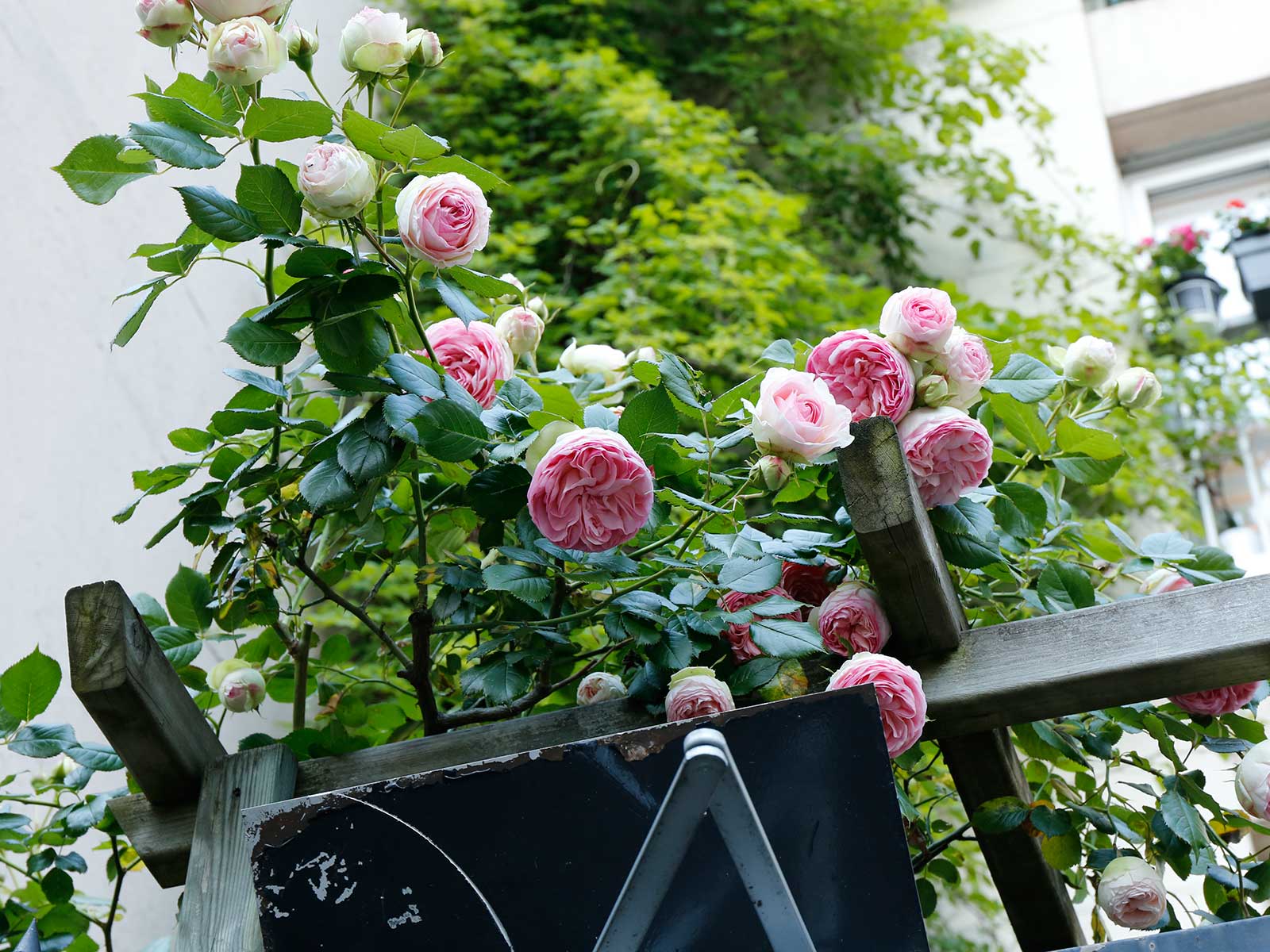 中心が淡いピンクの中輪八重咲きで、ツルは3~4mに伸びる。生育は旺盛だが、枝が細いため扱いやすく、狭いスペースでも誘引しやすい。5~6月に咲く一季咲きの花は香りが強めで、病気にも強い。