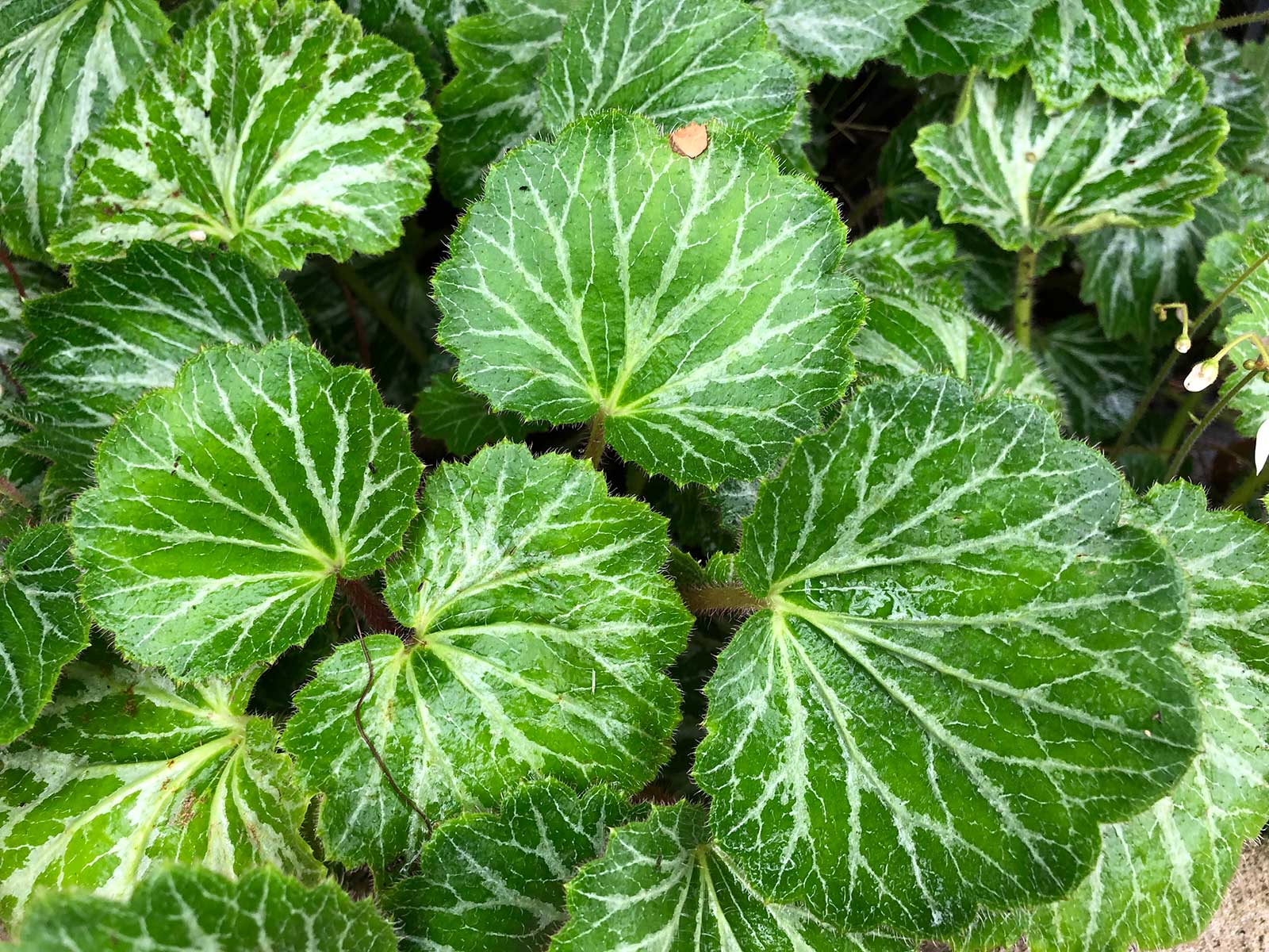 マット状に広がる常緑多年草で、円形の葉には毛が密に生え、葉脈が模様になります。イチゴと同じような細いランナーを出し、そこから根が出て子株を増やしていきます。