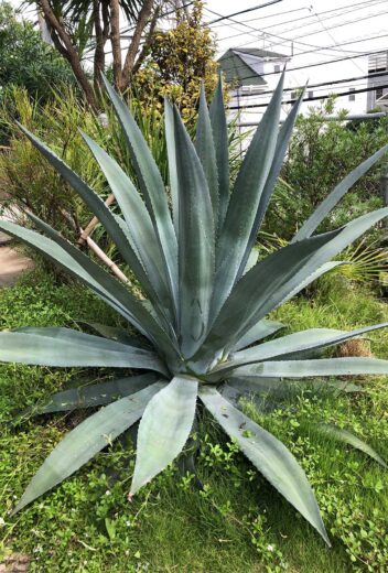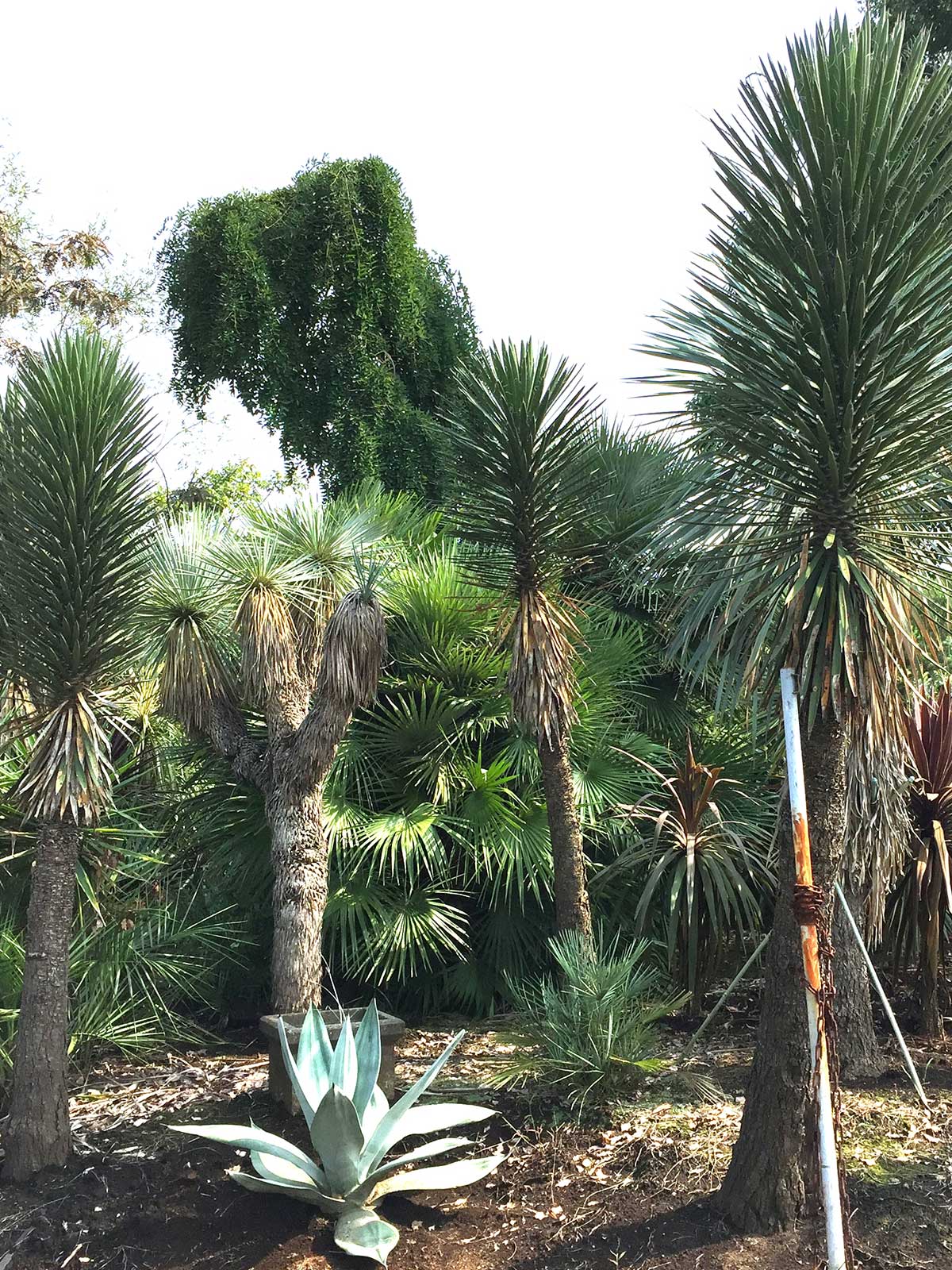 ロストラータは耐寒性が強く、葉先がやや刺状になり、ブルーの葉色が美しいです。フィリフェラは、葉先が鋭い刺状で密につき、単幹で背が高くなります。