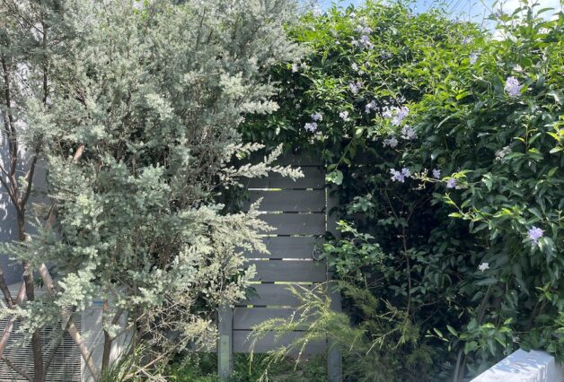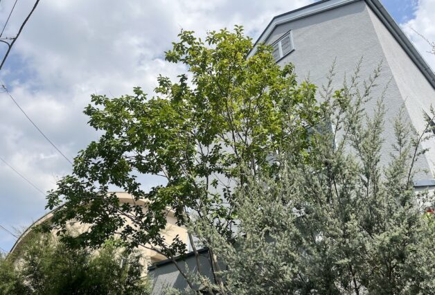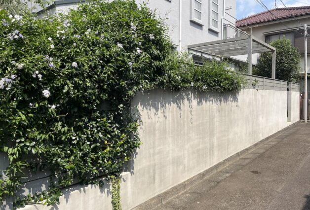 植栽は、常緑樹をメインに構成し、フェンスに絡むツルハナナスやスタージャスミンも加え、都市部における限られたスペースにおいても、施主の理想とする「植物に囲まれた住宅」を目指しています。