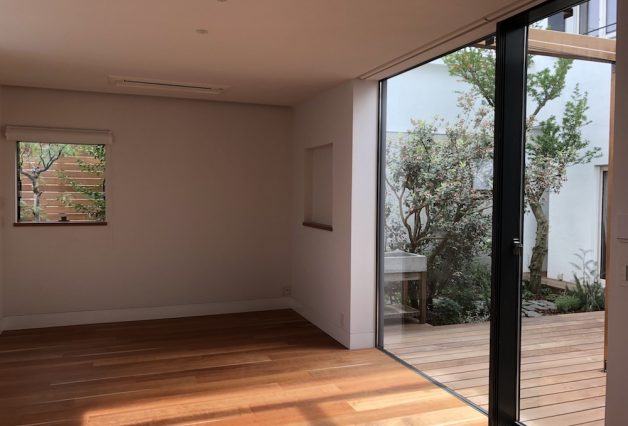 プライベート感を大事にした中庭は、ウッドデッキと植栽帯というシンプルな構成です。