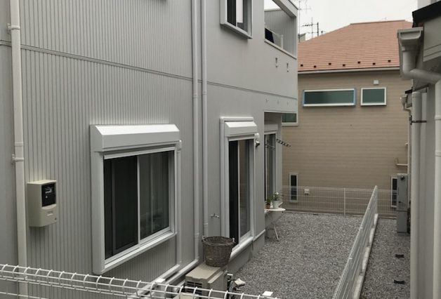 玄関のある私道より半階ほど低いリビングに面したお庭。