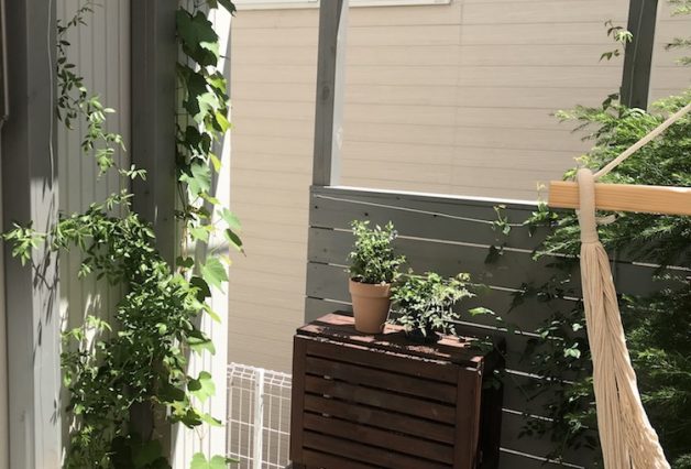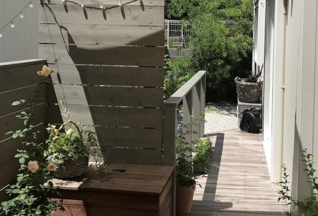 動線になる2つの掃き出し窓から出やすくなる様に全面にウッドデッキを作り、半分を低いフェンスで囲い、造作ベンチや日よけのタープを配置した、ゆっくりと過ごすプライベートなスペースとして、もう半分は植栽帯へと続くアプローチの役割を果たし、抜けのある手摺脇に植栽帯を設けることで、室内からの景色にグリーンの彩りを添えています。