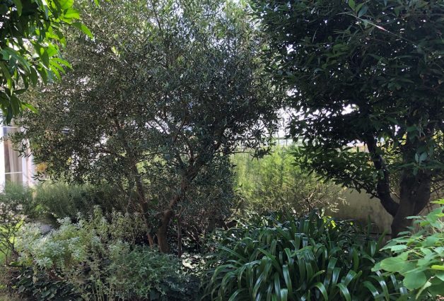 工事全体はゼネコンが担い、屋上部分のレイアウトや資材、備品などの全体プランニング・監修と植栽計画、また植栽や水栓など一部の工事を行いました。土壌厚も1m以上取り、敷地全体に潅水装置も敷設したことで、都心の屋上とは思えないほど植物も良く育っています。毎年たくさん実る夏みかんでオーナー様がジャムを作られています。ムタビリスやアイスバーグなどのバラも旺盛に育っています。