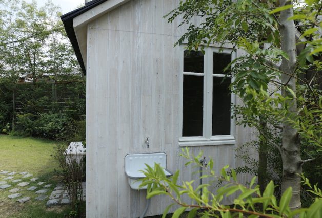 庭の奥の部分には2.5坪ほどのガーデンシェッドを設けました。緑の中で映えるようにレッドシダーの外壁材を白のステインで仕上げ、古いフランス製の窓と黒く塗られた瓦が印象的な建物になりました。室内には冷蔵庫なども置けるようにコンセントや手洗い用の流しも設置してあります。