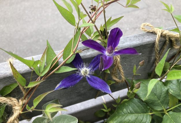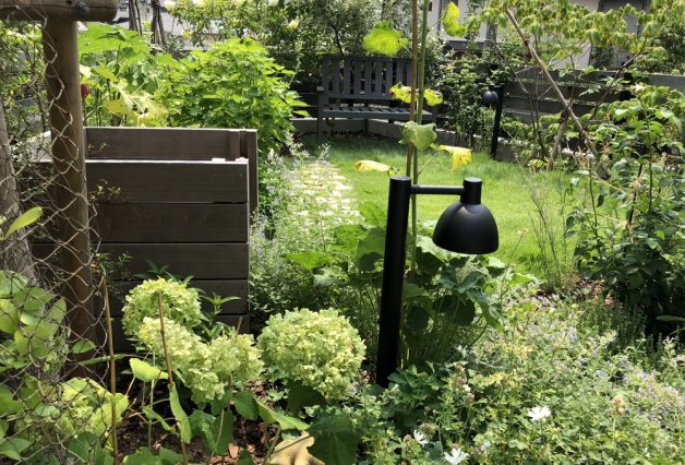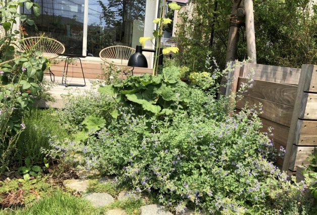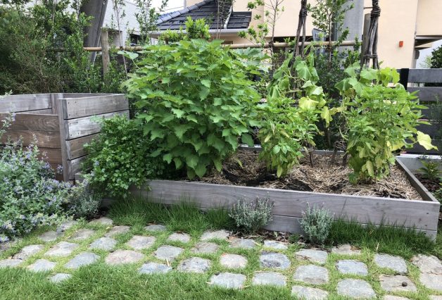 一畳ほどの菜園スペースやコンポストスペースも設け、石のテラスと芝生エリアを繋ぐ動線上に配したラフな木製アーチにはクレマチスが絡みます。