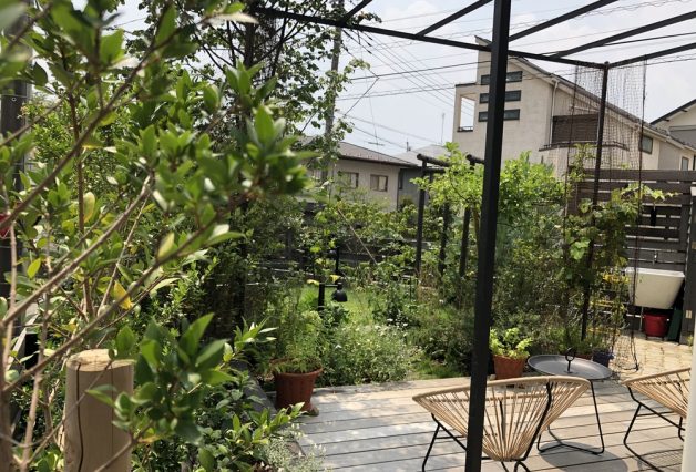 リビングに面した大きな掃き出しと繋がる場所にはウッドデッキを設け、木陰になるよう頭上にはスチールのパーゴラを作り、ブドウ・デラウェアを絡めています。