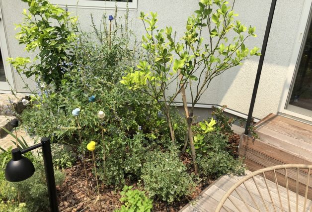 奥様からのリクエストで植えた香りのよい西洋菩提樹を中心に、柑橘類のベルガモットやバラ、スタンダード仕立てのヒメリンゴやアカシアなど、四季を通じて五感を楽しませてくれるような植物構成になっています。