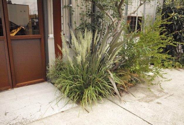 ファサードに面した植栽帯に山堀りの植木やつる植物を中心に野趣的な植木をその動きの絡みとトーンを合わせながら、一体的な面となるような構成で植栽を行っています。