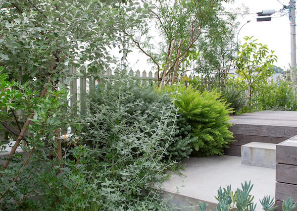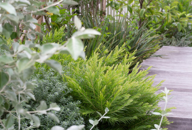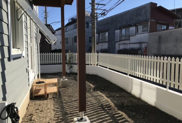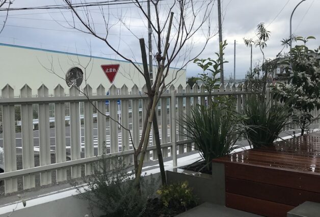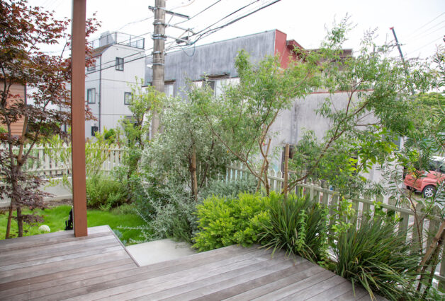 既存の白いフェンスは部屋からの目線では低い為、デッキの正面にモルタル仕上げの花壇枠を設ける事で植栽帯の高さを上げ、常緑を中心に、目隠しをしつつ抜けのある景色を保てるよう高さの出にくい樹種や低木を組み合わせて植栽しました。