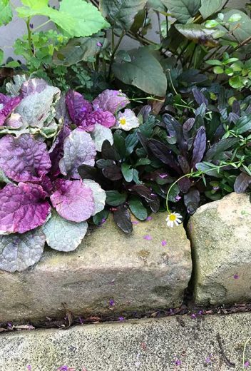 ファサードは構造物に柔らかい印象を加えることを意識し、限られた土のスペースでもその効果を発揮できるように植栽を配しています。門袖壁の足元には、タイムやアジュガがグランドカバーとして広がりながら、花を咲かせてアクセントにもなっています。シルバーティーツリーが風に揺れる影を門袖壁に落とし、どこか涼しげな雰囲気も感じられます。