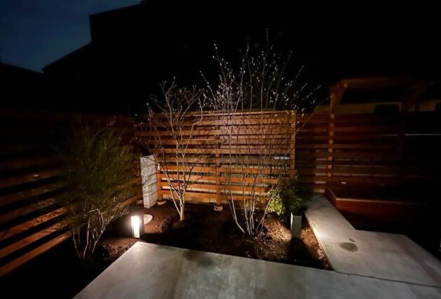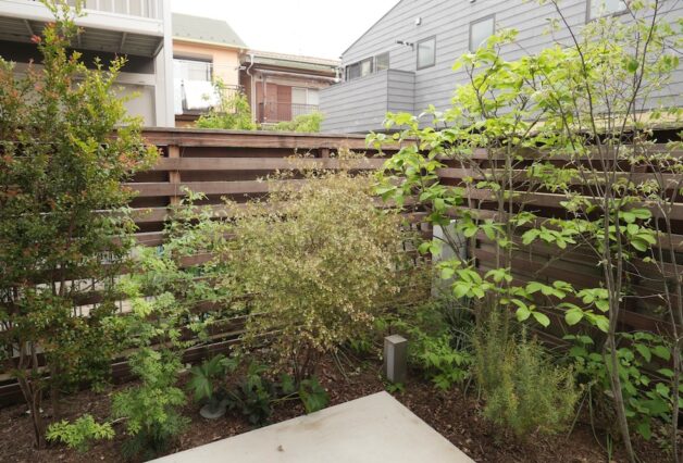 塗り壁やレンガの外壁が特徴的なお住まいにて外構と植栽を行いました。まわりに住宅は多いですが高層の建物は無く、日当たりの良い環境です。