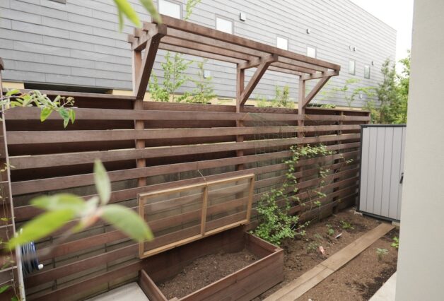 玄関の扉を開けると広々とした土間が続き、正面に大きくとられたガラスから自然光が差し込みます。その先のテラススペースでは、プライバシーを保つことと風通しが良いことの両立を図った構成となっています。菜園やコンポストに加えて、ブドウやブラックベリーなどベリー系の植栽を多用し、食卓とつながるお庭となりました。