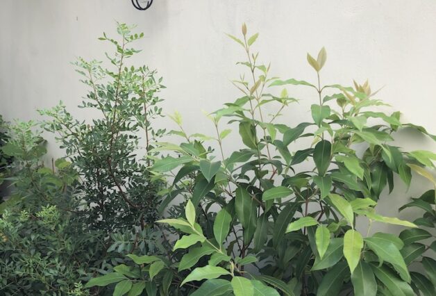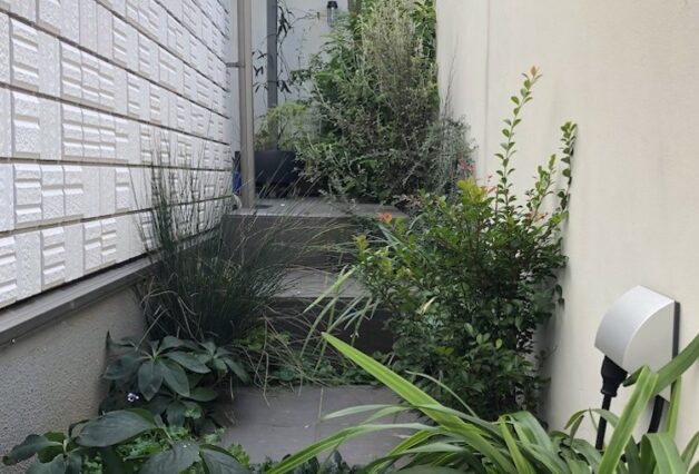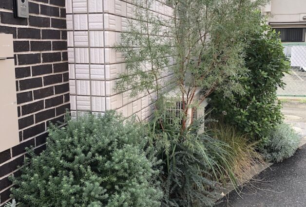構造物全体をモノトーンでまとめ、玄関まわりや通りに面したスペースは、お客様の希望でオリーブを中心に、常緑性の葉色の明るいピットスポラムやウエストリンギアなど、通年柔らかい葉色を楽しめる植物で構成しています。限られたスペースながら、2年経過し緑のボリューム感はしっかりと出ています。