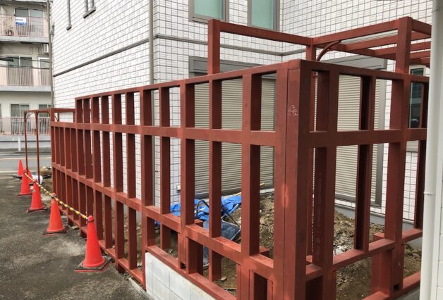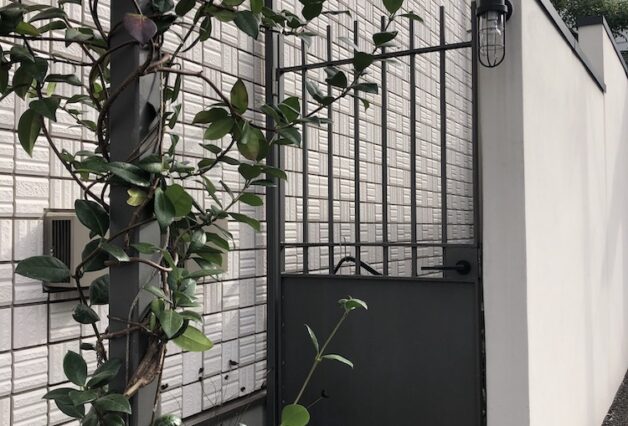 駐輪スペースには、スタージャスミンを絡めるためのスチール製のパーゴラを設置し、中庭へと続くアプローチには同じ仕上げのゲートを設けました。中庭はプライベート空間としてしっかり活用できるように、外周には鉄骨躯体の壁を設け、外でプロジェクターを使って映画をというご要望もあったため、白い左官仕上げにしています。