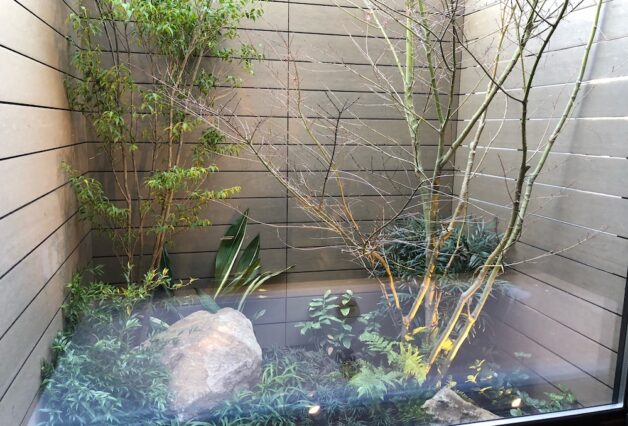 建物に合わせたクールな雰囲気を保ちつつ、和の要素も少し感じさせ、初期の緑のボリューム感もしっかりと出すというのがご要望でした。