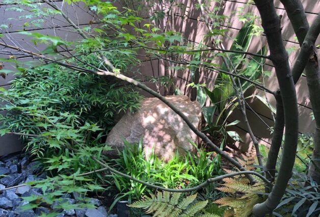 浴室に面した一坪ほどの坪庭は、新緑や紅葉が楽しめるモミジを中心にシダやハランなどの耐陰性種と景石を組み合わせ、和の趣を出しています。