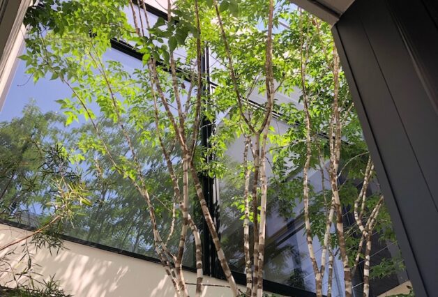 建物の中心にあり、各部屋からも見渡せるウッドデッキのテラスには、6mのアオダモの株立ちを入れています。