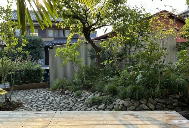 道路や隣家からの視線を隠しつつ、それぞれの窓から植物が見えることがご要望だったため、上からの目線が気になる部分にウッドフェンスやパーゴラを設置し、アカシア・ディアネイやブラックティーツリー、シマグミなどの常緑樹を植栽しました。