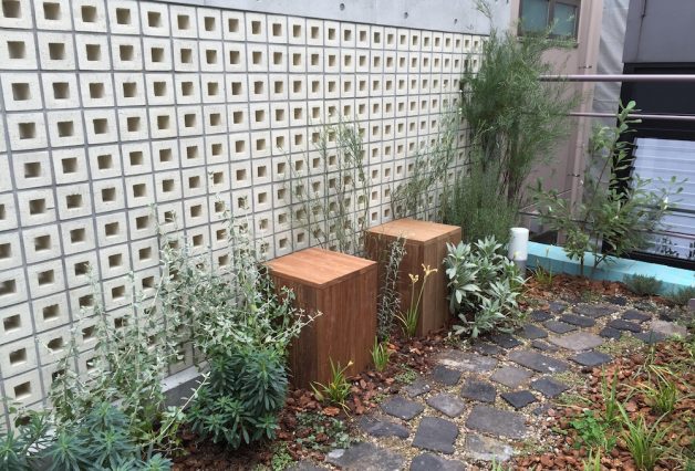 通路には大きさの異なる黒レンガを加工して丸みを出し、小道のような舗装にしました。目地には当初ダイコンドラの種を播き、2~3年は維持できていましたが今はなくなってしまっています。中二階の通路の植物もいくつかは淘汰されてしまいましたが、人工土壌ど相性が良い植物達はしっかり根付いてくれました。