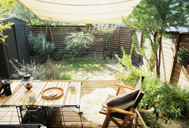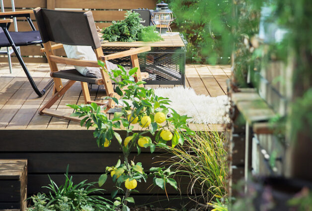 アプローチから庭へと続く動線には、芝生を保護しながら景観にも変化を加える目的で、敷石をランダムに配置しました。ウッドデッキに面したスペースには、活用の幅が広い柚子を植樹。その他の植栽は、シマグミ、ジューンベリー、アナベル、矮性のタイサンボクなどを選定し、開花や結実のタイミングを考慮した季節感のある構成としています。
