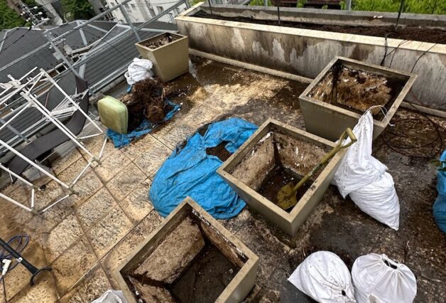 10年くらい前の入居時と数年前に別な業社での工事が行われていましたが、上手くいかなかったため、今回お声がけいただきました。オリジナルの金属製の大きなプランターや花壇には、ゲッケイジュやシェフレラなど常緑性の樹木が植えられていましたが、根詰まりと排水不良で虫や病気が蔓延り、枯れてしまったものや生きていても瀕死の状態の木がほとんどでした。