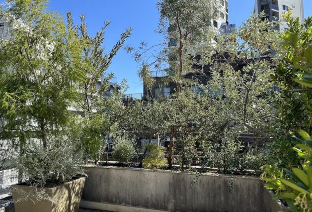 撤去と共に土壌は排水と保水が良い軽量土壌に交換や改良を施し、潅水装置も設置し直しました。周囲の高層マンションからの視線を遮るために、同じように常緑樹で構成していますが、オーストラリア系の樹木を中心に多種類をミックスし、目隠しになるようにしています。どれも比較的限られた土壌でも生育しやすい品種を選んでいますが、数年内での淘汰も想定し、将来的には樹種が少し絞られつつも、適応した種類でしっかりグリーンを確保できるようにしています。