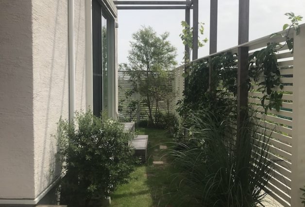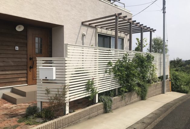 歩道からの目隠しをしつつ、周辺に広がる田んぼや、植木屋の畑など、素晴らしい眺めを借景として取り入れられるよう、エリアごとにフェンスの目地や高さに変化をつけて工夫しました。高さのあるフェンスの控え梁や柱をパーゴラや機能門柱としても利用しています。