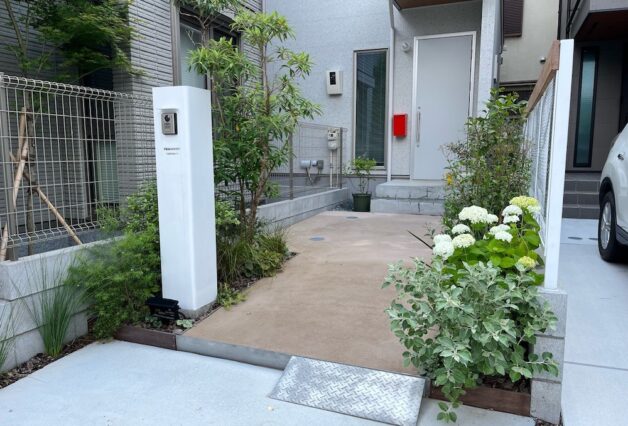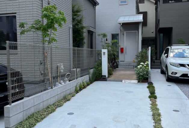 また、高低差を利用して、コンクリートブロックで新たに土留めを作り、客土をすることで、隣地駐車スペースより高い位置に植栽エリアが設けられ、手摺ほどの低いフェンスと、低木が中心の植栽でも、緩やかなプライベート感のある場になりました。