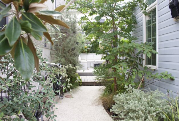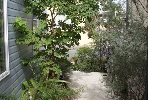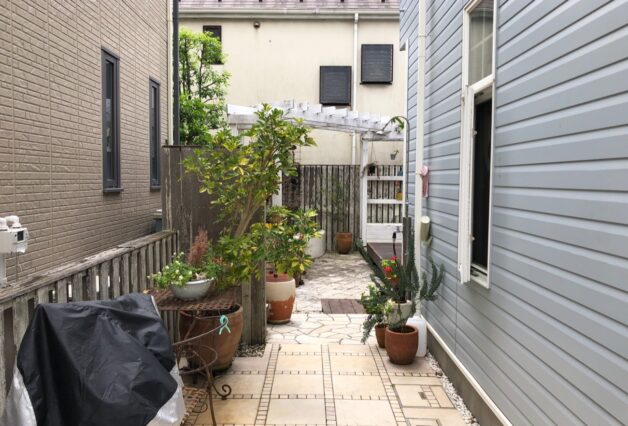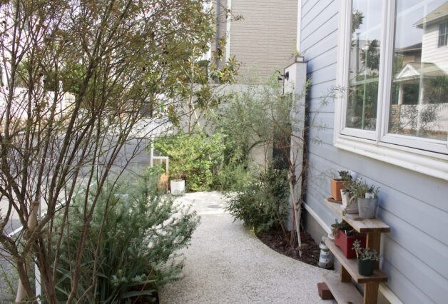 海まで歩いて5分という立地。道路に面した玄関周りと敷地の奥に位置するお庭、それぞれをつなぐ通路部分のご提案をさせて頂きました。