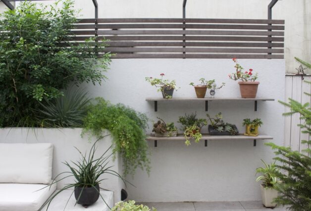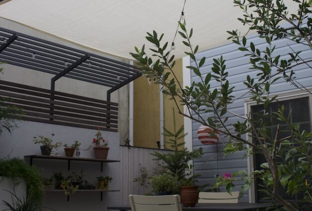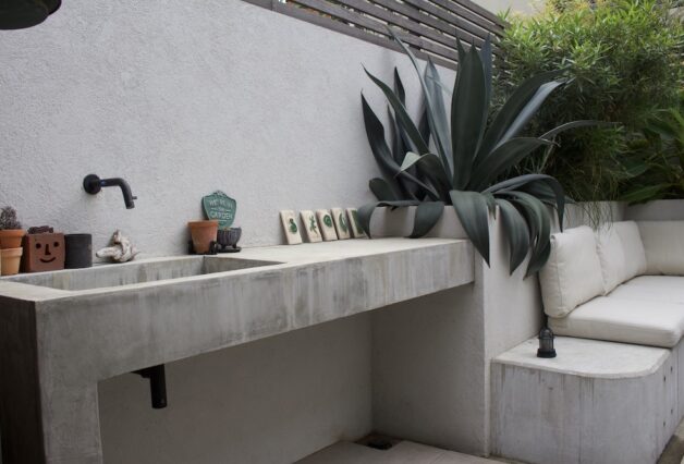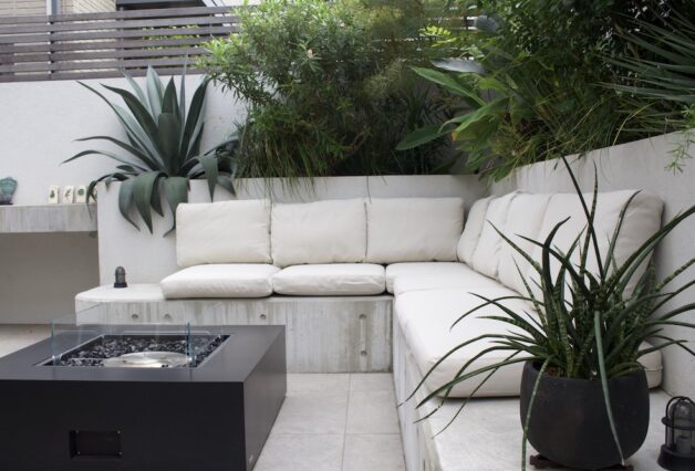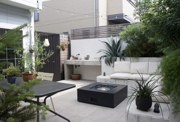 メインとなるお庭は、経年変化に加え、潮の影響と周りを住宅に囲まれている関係で、少しジメッとした印象でした。今後のメンテナンス性も考慮し、ドライな印象のすっきりとしたタイルテラスに作り替えるご提案をさせて頂きました。お庭の空間構成としては、コンクリート製の作り付けのベンチ(屋外用のクッションを置くことでソファに)と環境に配慮した燃料(バイオエタノール)を使用した暖炉を設えた「リビングエリア」と隣地の印象を和らげるパーゴラにタープを掛け、その下にお持ちのテーブルと椅子を配置した「ダイニングエリア」で構成されています。植物好きなご夫婦なので、すっきりした中にも彩りとしての植物が加わるように、ベンチの後方に花壇をつくり、量は抑えながらも植物に囲まれたプライベート感のあるお庭を目指しました。チュウキンレンやアガベなど個性的な植物が並びます。