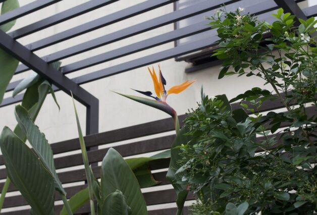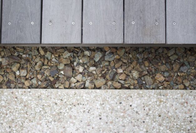 開かれたフロントガーデンとプライベートなタイルテラスの空間を切り替える役目を担っているのが、収納小屋と温水シャワーの機能を有した天井ルーバーのついたウッドデッキスペースです。小径から1段上げた高さにウッドデッキを設ける事で、小径とテラスの高さをつなぐステップにもなっています。マテリアル感としても、既存の建築とのバランスを考慮したフロント周りの雰囲気と新しく加えたモダンですっきりとしたテラス部の雰囲気の切り替わりを繋ぐ役割も担っています。