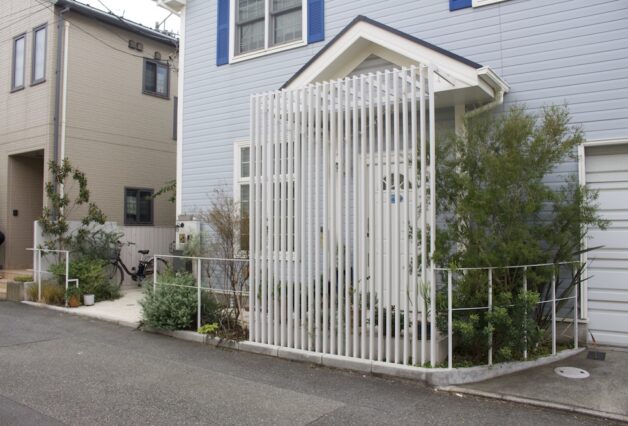 玄関周りは、ブロック壁と木製ゲートによりクローズな印象だった外構を、茅ヶ崎という立地を考慮し、オープンな外構に変更しました。スチールの縦ルーバーや手すりに植栽を加えて道路と緩やかに仕切り、洗い出しで舗装した小径の両サイドには目線を遮る大小の植栽を配置しています。オープンな外構にした事で、フロントガーデンとして通学中の小中学生やお散歩しているご近所の方々にもお楽しみ頂いております。