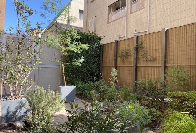 現状復旧が条件となるマンションでは構造物の設置方法も限定されます。フェンスは容易に取り外せる仕様にし、レンガの舗装もモルタル等で固定せず砂で目地を埋めています。