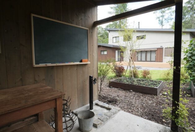 菜園枠にはじゃがいもやトマト、きゅうりなど季節の野菜が実っています。ブルーベリーなどの果樹も植栽しており、様々な食物の収穫を楽しむことができます。落ち葉や乾燥させた生ごみはコンポストにて時間をかけてこれらの肥料となります。