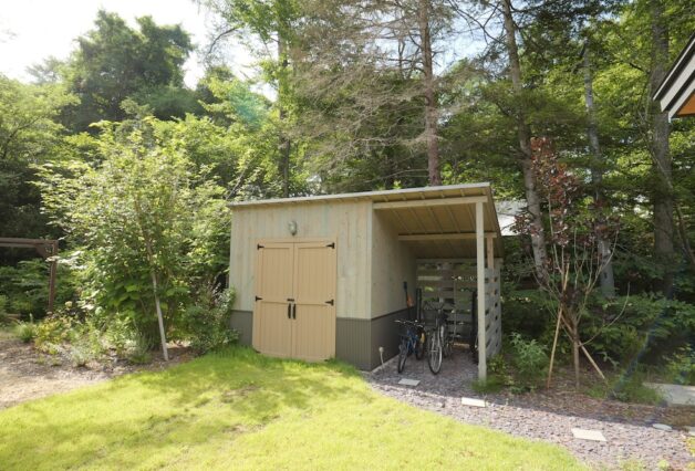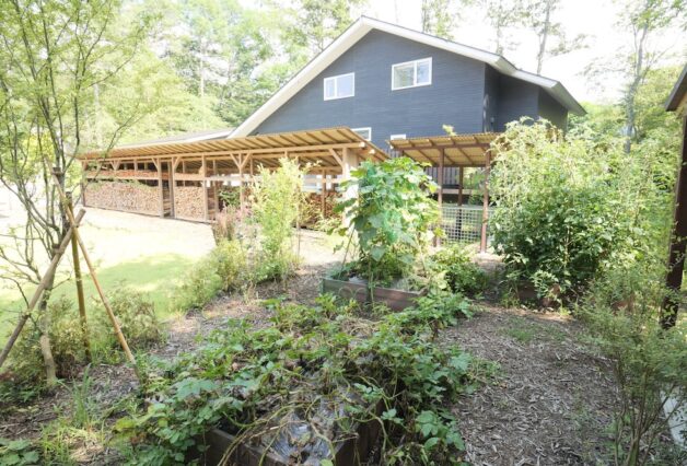 スキーやキャンプなどのレジャー用品や園芸用品は2つの物置小屋に収納します。小屋の屋根は広く張り出し菜園作業のスペースやサイクルポートとして活用できるようにしました。