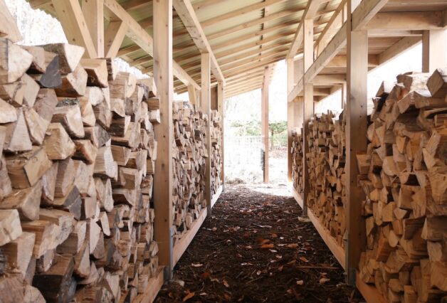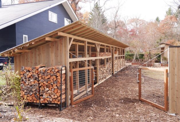 寒さが厳しいためこちらのお住まいでは薪ストーブを使用しています。数年分の薪を貯蔵するための薪棚には中央に通路を設けて、しっかり乾燥した薪から運び出せるようにしています。